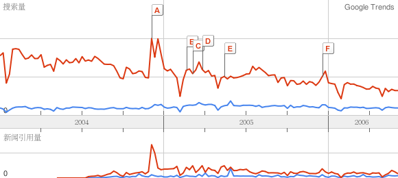 3、標(biāo)注,百度指數(shù)不提供標(biāo)注,就是說只能看到變動的趨勢,卻無法知道為什么會引起這樣的線圖變化,google就提供標(biāo)注,例如在圖片上看到,在峰值的位置,有A、B、C、D、E這樣的標(biāo)注,在旁邊,就有當(dāng)時的新聞,這點是google trends最好的地方,一個關(guān)鍵字在如此大量的搜索基數(shù)面前還會有如此大幅度的變化,肯定是某些原因引起的,可能是負面新聞,可能是明星,可能是增加了廣告投入,在google中不但能體現(xiàn),還可以知道事情的發(fā)生,對于媒體人士來說非常有用,可以隨時回顧當(dāng)時的事情。