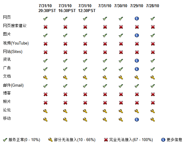 本頁面顯示谷歌服務(wù)在中國大陸的可用性。服務(wù)狀態(tài)由分布于不同區(qū)域的用于監(jiān)控連接能力的服務(wù)器確定。在中國的服務(wù)狀態(tài)經(jīng)常變動。這些狀態(tài)結(jié)果可能不能反映經(jīng)常發(fā)生的小范圍的屏蔽,或個人體驗到的問題,如關(guān)鍵詞屏蔽可能短期影響訪問谷歌服務(wù)。